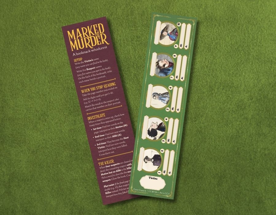 Marked for Murder is a bookmark-sized game you play while you read. As you move through the book, you pluck names from its pages to mark a victim and five suspects. Returning to them again and again, you interpret found words as motives, alibis, and deaths—clearing the innocent, exposing deceptions, and watching new murders unfold. By the time you close the book, only one suspect remains to be framed as the killer.